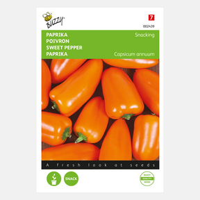Paprika – Snacking mini orange. Semer de février à mai sous serre. Plante très productive de parikas orange délicieusement sucrées de taille snack. Peut être cultivé en serre mais aussi à l'extérieur en pot.