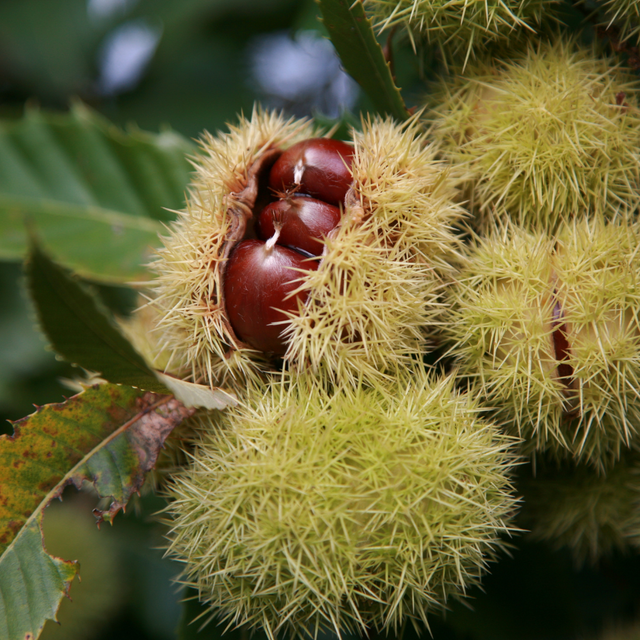This low-stemmed chestnut tree has no specific cultivar; it is the original chestnut, Castanea sativa. It is a compact tree ideal for smaller gardens. At 3 to 5 meters tall, it offers an abundance of edible chestnuts in autumn. The chestnuts have a sweet, nutty flavor and are perfect for various culinary uses. The tree thrives in well-drained, fertile soil and requires a sunny location for optimal growth. Regular pruning promotes a beautiful crown and healthy growth.