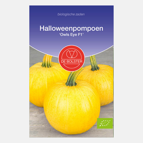 Halloween pumpkin 'Owls Eye F1' is a decorative pumpkin with a flat bottom. This allows this pumpkin to stand upright. Each plant produces an average of one or two fruits weighing 4 to 7 kilos. One bag is for approximately 8m2, and the planting distance is 750x70 cm.