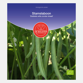 ‘Dubbele witte zonder draad' is een boon die bij slechte weersomstandigheden weinig schimmelgevoelig is. Deze stamslaboon is heel smakelijk en mals. Zaaien kan vanaf begin mei. Eén zakje is voor circa 14m2, en de plantafstand bedraagt 45x10 cm.