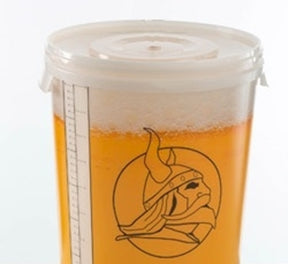 Cette cuve de fermentation graduée est une version en plastique. Le couvercle du fût est percé pour installer un joint hydraulique, et une ouverture est prévue en bas pour monter un robinet.